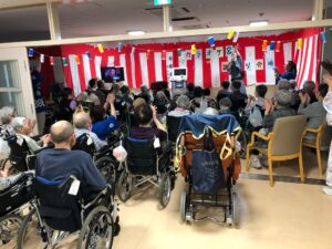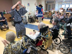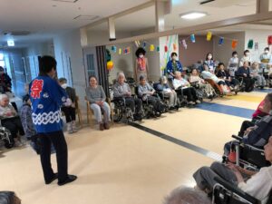 スタッフが浴衣姿で踊る中、手拍子をしたり、一緒に踊ってくださる方もいて、会場全体が楽しい雰囲気に包まれました。これまで、なかなか大規模なイベントを開催することが難しい時期もありましたが、皆さまのご協力のもと、無事に開催することができました。これからも、入所されている皆さまが笑顔で過ごせる行事を企画してまいります。
