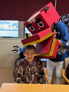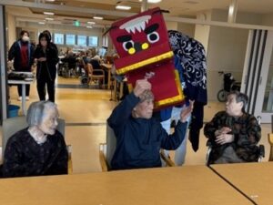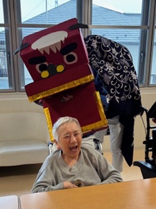 獅子舞は利用者様お一人おひとりのもとへ回り、頭をかぶりつく場面もありました。