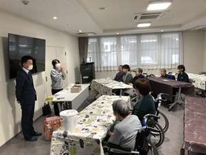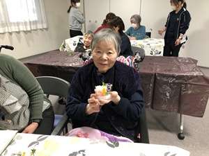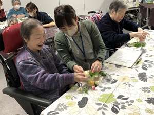色とりどりの花材やリボン、小さな飾りを用意し、世界に一つだけのミニボックス作りに挑戦していただきました。最初は少し不安そうな様子も見られましたが、いざ作り始めると皆さまとても真剣な表情。花の色の組み合わせを考えたり、ここにお花を足そうかなと職員や講師の方と相談しながら、楽しく作業を進めていらっしゃいました。