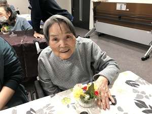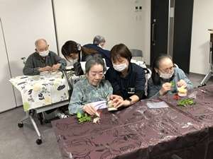 色とりどりの花材やリボン、小さな飾りを用意し、世界に一つだけのミニボックス作りに挑戦していただきました。最初は少し不安そうな様子も見られましたが、いざ作り始めると皆さまとても真剣な表情。花の色の組み合わせを考えたり、ここにお花を足そうかなと職員や講師の方と相談しながら、楽しく作業を進めていらっしゃいました。